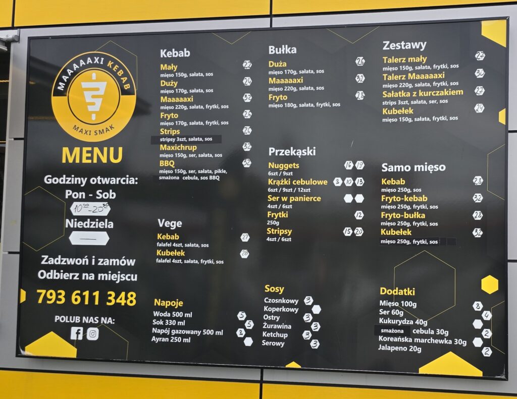 Są takie dni, kiedy człowiek po prostu potrzebuje solidnego kebaba na talerzu. I tym razem trafiłem do lokalu Maaaaxi Kebab (menu poniżej) — miejsca, które obiecuje „maxi smak” w każdej porcji. Zamówiłem zestaw Talerz Maaaaxi z kurczakiem, sałatą, frytkami i sosem… i powiem jedno: nazwa absolutnie nie przesadza.